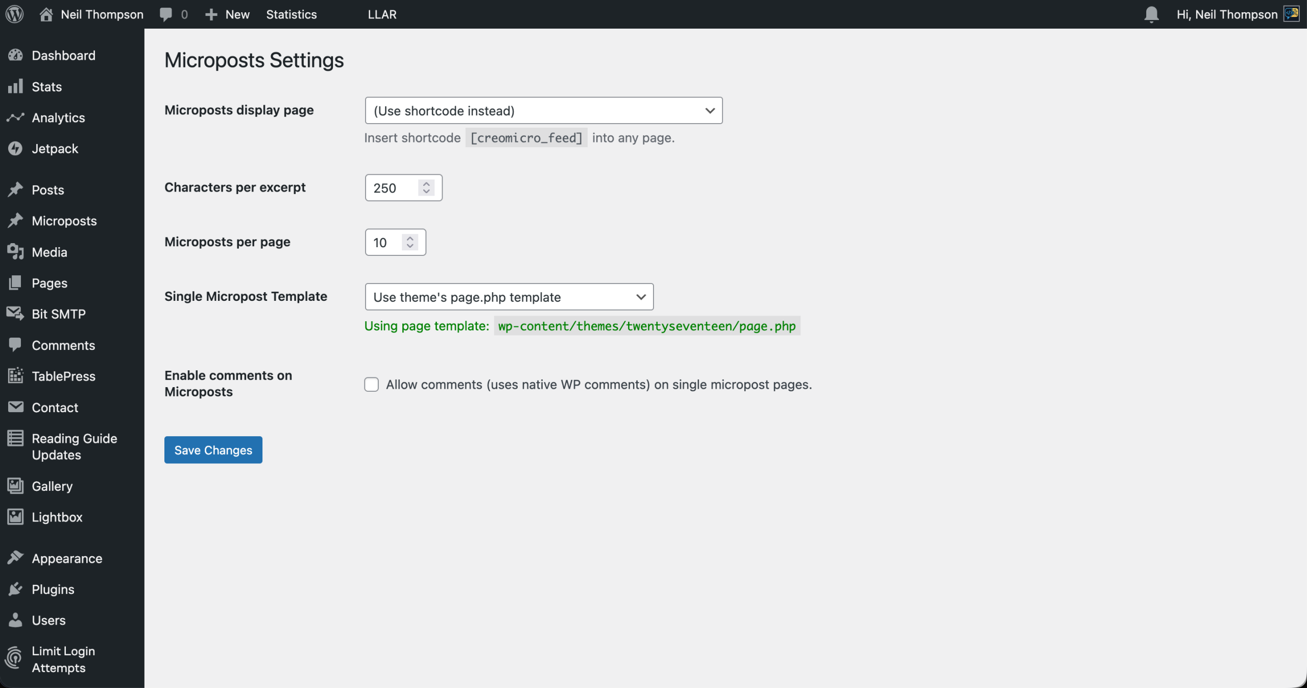 I have accounts on plenty of microblogging sites (Twitter, Mastodon, Bluesky and even Threads) but they are all owned and controlled by someone else. I decided that I wanted something that I could use and manage, and a quick search came up with Michael Gbadebo‘s WordPress plugin called Microposts.